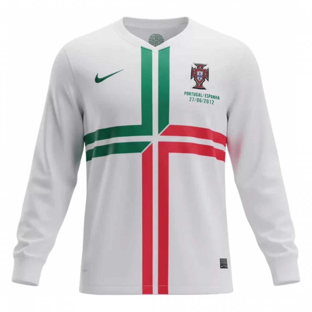 Step back to a memorable night in football history with the Retro Soccer Jersey Portugal Away Long Sleeve 2012. Featuring a striking white base, this jersey is adorned with bold green and red stripes intersecting in a cross pattern, symbolizing the heart of Portugal’s national pride. The crest and commemorative date honor the iconic Portugal vs. Spain match in 2012, combining heritage with style. Crafted from lightweight, breathable fabric with advanced moisture-wicking properties, this jersey is made to keep you comfortable both on and off the pitch.