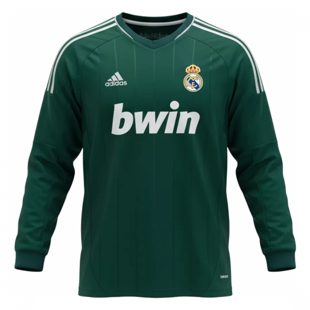 Step back into a legendary season with the Retro Soccer Jersey Real Madrid Third Away Long Sleeve 2012/13. Featuring a rich deep green base accented by clean white stripes and subtle pinstripes, this jersey captures the spirit of Real Madrid’s fearless pursuit of excellence. The classic crest and sponsor detail pay homage to the club’s storied history, celebrating one of their iconic campaigns on the road. Designed for comfort and performance, it combines breathable, moisture-wicking fabric with a lightweight feel to keep you fresh throughout the game.