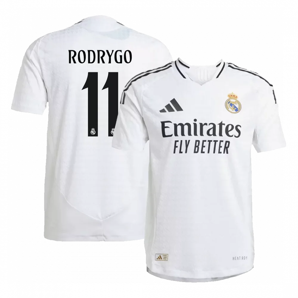 Step into the legacy of one of football’s most storied clubs with the Rodrygo #11 Real Madrid Home Authentic Soccer Jersey. Featuring a clean, classic white design with sleek black accents and the iconic Real Madrid crest, this kit embodies the club’s tradition of elegance and excellence. Engineered with breathable, lightweight fabric and advanced moisture-wicking properties, it keeps you cool and comfortable whether on the pitch or in the stands.