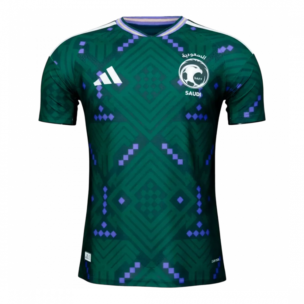 Step onto the pitch with pride in the Saudi Arabia Home Player Version Jersey for the World Cup 2026. The rich green base highlights traditional geometric patterns inspired by Arabian art, accented with subtle purple pixelated details that symbolize modern unity and heritage. A nod to the nation’s vibrant culture and football legacy, this jersey embodies the spirit and passion of Saudi football.