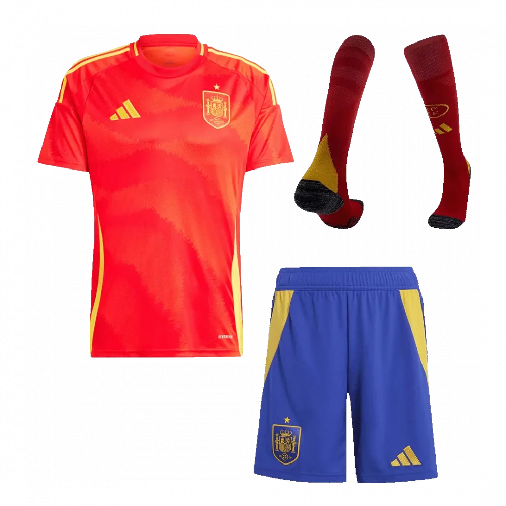 Stand proud in the Spain Home Jerseys Full Kit EURO, a vibrant blend of tradition and modern performance. The fiery red jersey, adorned with subtle tonal patterns and royal yellow accents, honors Spain’s rich football heritage and passion for flair on the field. Paired with striking blue shorts and bold red socks, this full kit embodies the spirit of La Roja with every stitch.