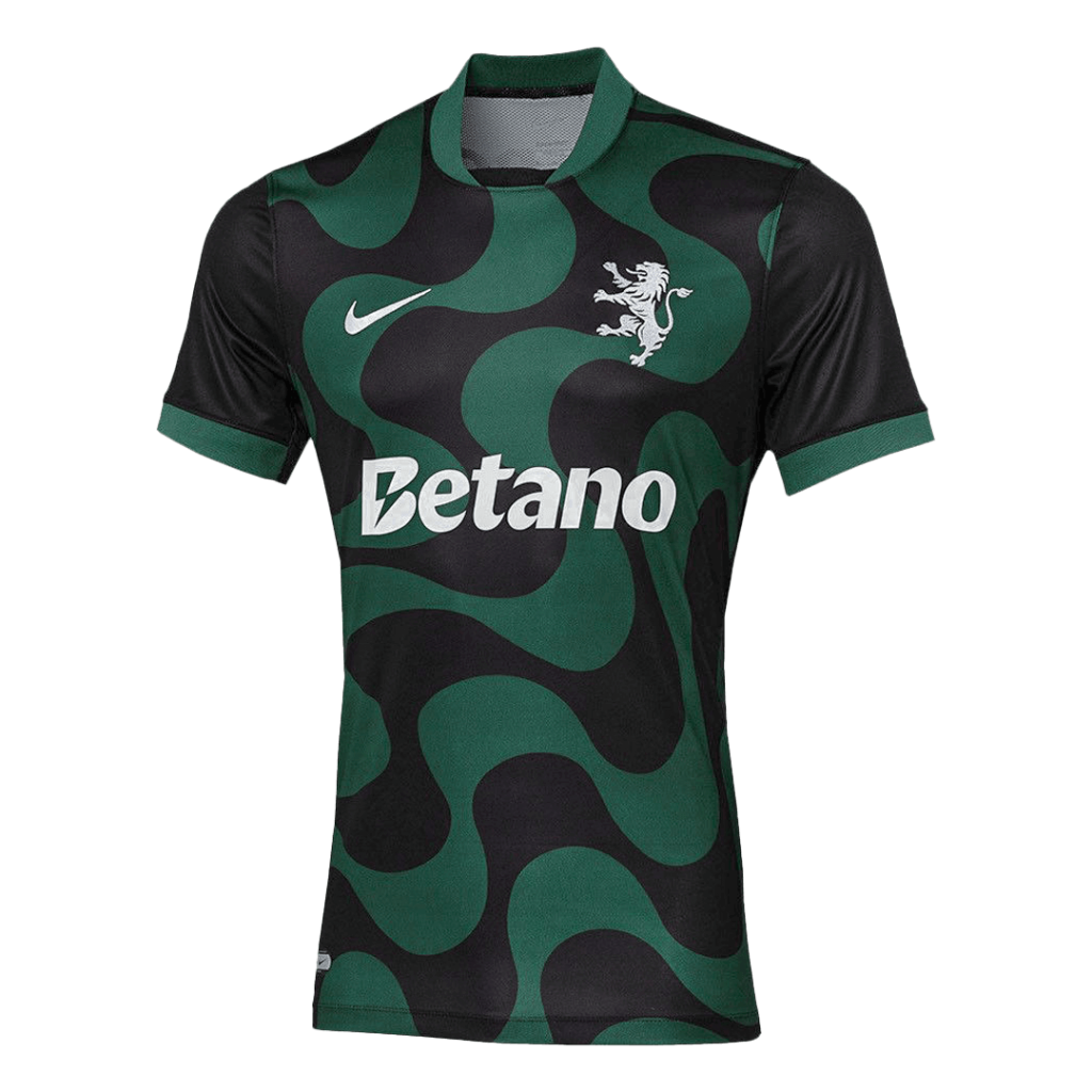 Step into the future of Sporting CP with the 2025/26 Alternative Soccer Jersey, featuring a striking black base complemented by dynamic green wave patterns that evoke the club’s spirit of resilience and innovation. This bold design pays homage to Sporting’s proud history while showcasing a modern twist, crowned by the iconic lion emblem that symbolizes strength and courage on the pitch.