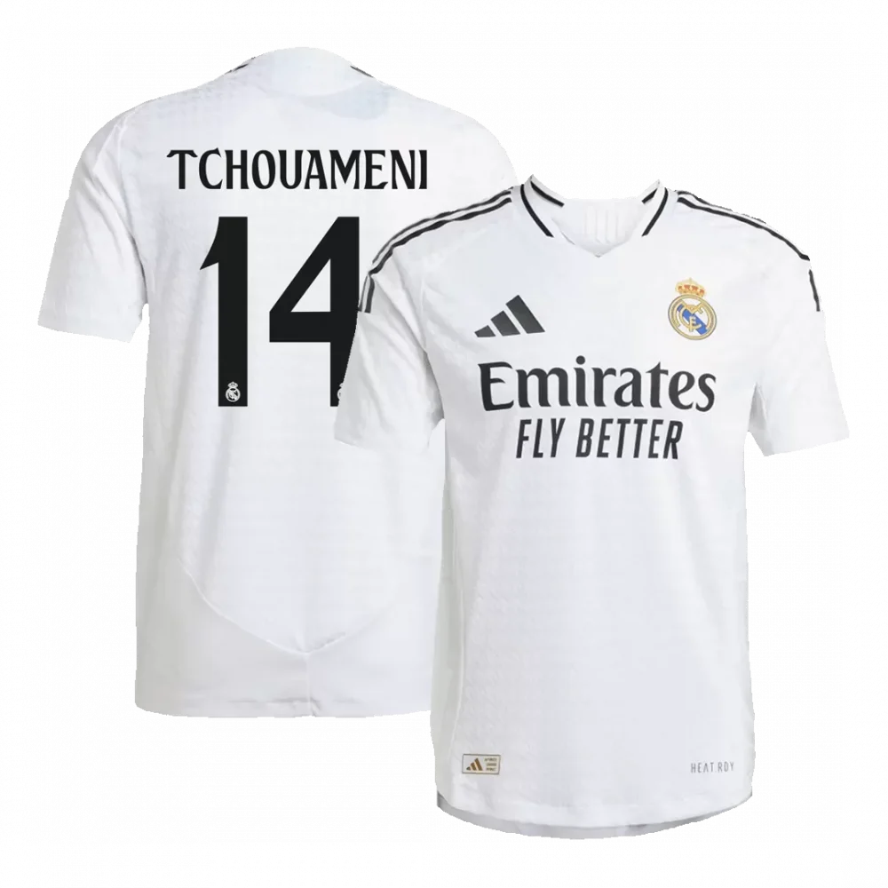 Step onto the pitch like a true Galáctico in the Tchouameni #14 Real Madrid Home Authentic Soccer Jersey. Featuring the iconic pristine white base with subtle textural patterns and sharp black accents along the collar and shoulders, this jersey celebrates the timeless elegance and legendary history of Los Blancos. It embodies the spirit of Madrid’s pursuit of excellence and relentless ambition.