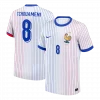 Step into the spirit of French football with the UPAMECANO #4 France Away Soccer Jersey, featuring a bold design of alternating blue and red pinstripes on a crisp white backdrop. This jersey pays tribute to the national colors that symbolize France’s proud football legacy and fighting spirit on the international stage. Equipped with breathable, lightweight fabric and advanced moisture-wicking technology, it ensures you stay comfortable during every match or training session.