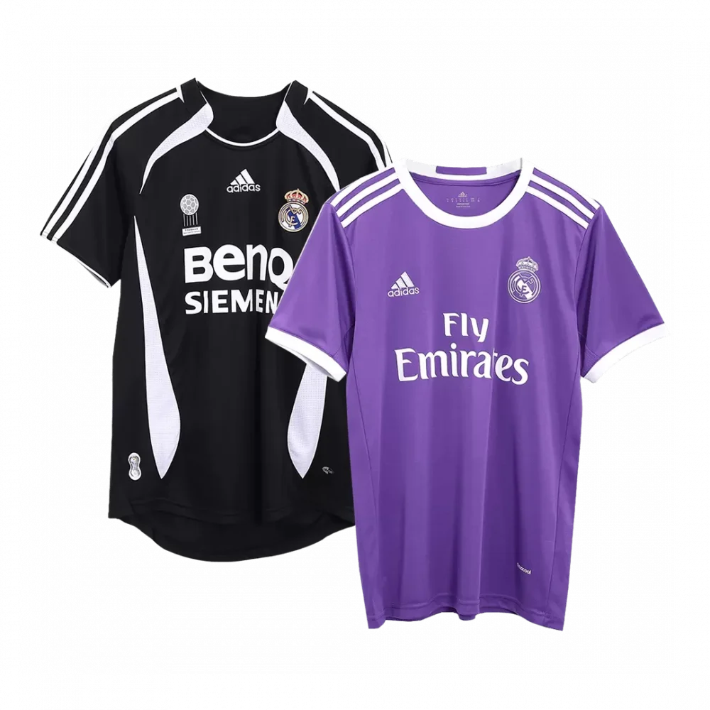 Step back into unforgettable moments of football history with these Vintage Real Madrid Away Jerseys from the 2006/07 and 2016/17 seasons. The 2006/07 classic features a bold black base with striking white accents, embodying the team’s fierce competitive spirit, while the 2016/17 edition shines in vibrant purple with clean white trim, reflecting Real Madrid’s elegance and royal legacy. Both designs celebrate the club’s rich tradition of excellence on the global stage.