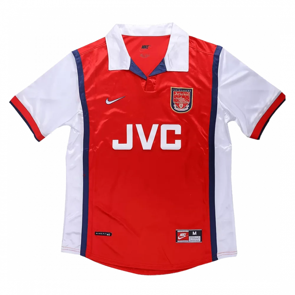 Step back into one of Arsenal’s most iconic eras with the Vintage 1998/99 Home Jersey. Featuring the club’s classic red body framed by striking white sleeves and deep navy side panels, this design pays tribute to The Gunners’ proud tradition of style and grit. The sharp white collar and bold sponsor logo complete a look that fans revere, capturing the spirit of a team on the rise.