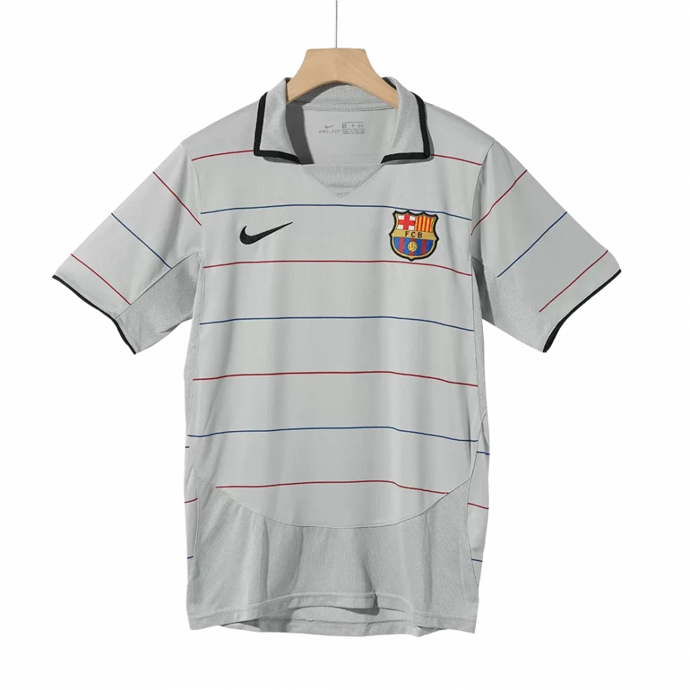 Step back into one of FC Barcelona’s iconic away seasons with this Vintage 2003/04 Soccer Jersey. Featuring a sleek silver base accented by subtle red and blue horizontal stripes, this design pays homage to Barça’s elegant yet bold style. The classic black-trimmed collar and the embroidered crest bring authentic club pride, celebrating the rich heritage of a team that defines attacking football.