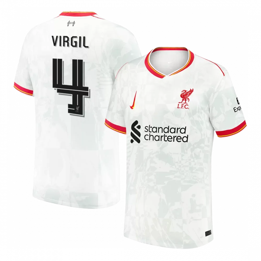 Step into the heart of Liverpool’s legacy with the VIRGIL #4 Liverpool Third Away Soccer Jersey, crafted for both fans and athletes alike. This sleek white jersey features subtle patchwork patterns throughout, bordered by vibrant red and yellow accents on the collar and sleeve cuffs—a nod to the club’s fiery spirit and historic resilience. Emblazoned with the iconic Liverbird crest and bold player details, this jersey celebrates Liverpool’s relentless pursuit of glory on the UCL stage.