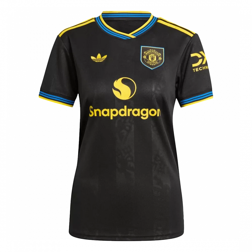 Step onto the pitch with the Women’s Manchester United Third Away Jersey 2025/26, where bold black meets vibrant yellow and electric blue accents for a striking look. This design pays homage to the club’s rich heritage with modern touches, featuring subtle tonal patterns that celebrate Manchester United’s legendary spirit. Lightweight and breathable, this jersey keeps you cool and comfortable whether cheering from the stands or on the move.
